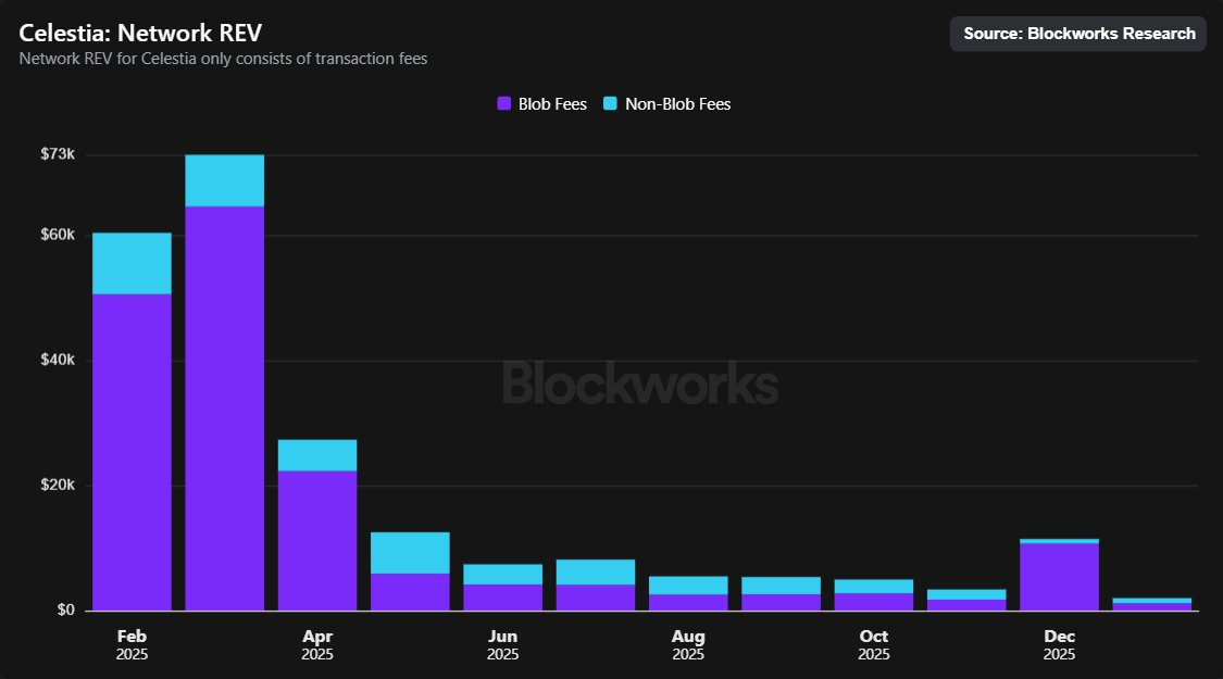 与此同时,表现最差的两个板块是模块化(Modular)赛道和 Solana 生态。讽刺的是,这两个在理念上截然不同的方向,却同时成为跌幅最大的板块,但原因其实很清晰。模块化协议尚未找到真正的产品市场契合点(PMF)。其代表性代币 TIA 已下跌 90%。Celestia 在去年年初的流通市值一度超过 20 亿美元,但接下来的 12 个月仅产生约 27 万美元的实际收入。其月收入从 2025 年 3 月的峰值 7.3 万美元一路下滑,到 2026 年 1 月仅剩 1900 美元。